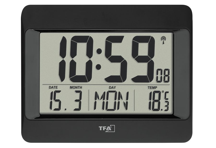 Kunststoff, höchste Genauigkeit, Wochentag in 8 Sprachen und Datum, Anzeige der Innentemperatur, von Sekunden oder Kalenderwochen, Weckalarm mit Snooze-Funktion·schwarz 313 g, (LxBxH): 21,5x2,8x16 cm