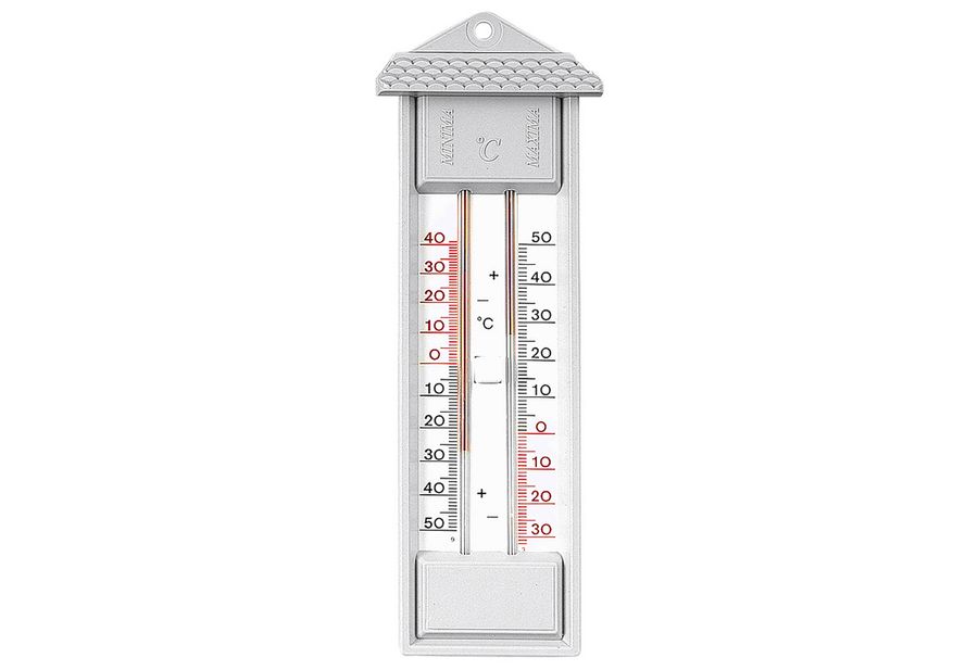 Kunststoff, für den Innen- und Außenbereich geeignet, drei Werte gleichzeitig im Blick: aktuelle Temperatur, Höchsttemperatur und tiefste Temperatur, Beobachtungszeitraum kann durch Tastendruck selbst bestimmt werden, Messbereich -40 C° bis +50 °C, wetterfest, Kapillare mit einer quecksilberfreien, patentierten Flüssigkeit gefüllt, zu Hängen·grau (LxBxH): 8x3,2x23,2 cm