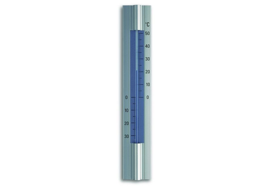 Aluminium eloxiert, blaue Skala, wetterfest, Messbereich -30 °C bis +50 °C, eine 2-Punkt-Justierung macht es besonders genau, Kapillaren mit einer speziell eingefärbten Thermometerflüssigkeit gefüllt, zum Hängen·silber / blau (LxBxH): 5x1,4x30 cm