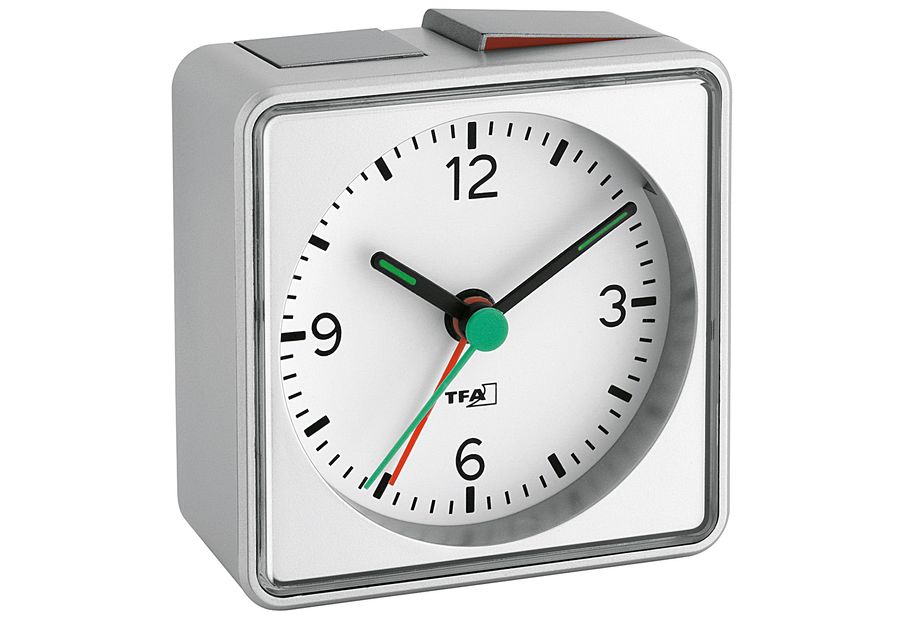 Kunststoff, Quarzuhr, analoge Anzeige mit fluoreszierenden Zeigern, Alarm mit Snooze-Funktion, leises Sweep-Uhrwerk, ansteigender Alarmton (Crescendo), Hintergrundbeleuchtung, zum Stellen, benötigte Batterie 1 x 1,5 V AA (nicht enthalten)·silberfarben (LxBxH): 7x3,7x7 cm