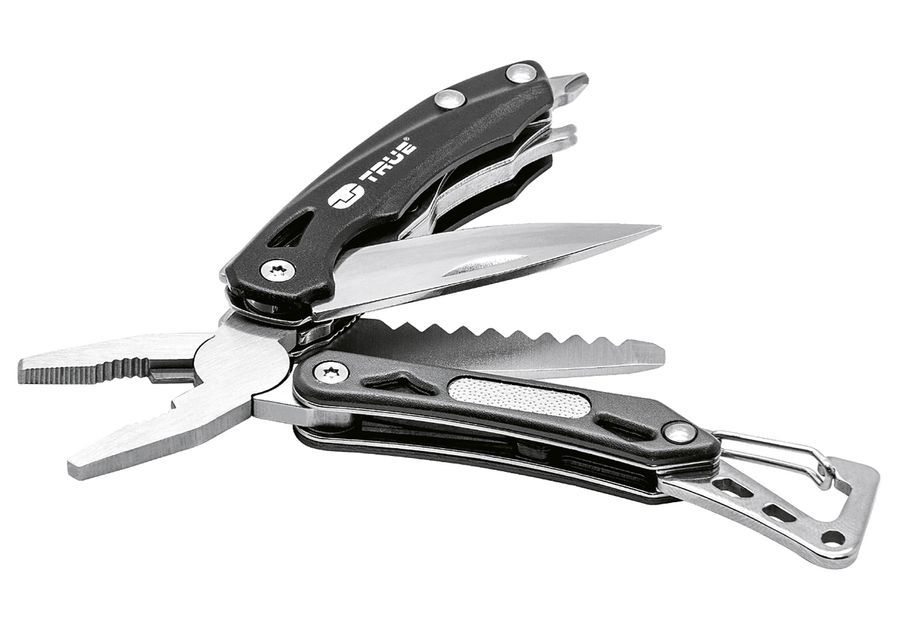 Edelstahl, ergonomischer Griff aus eloxiertem Flugzeugaluminium, mit einem Schnellverschluss-Karabinerclip leicht am Schlüsselbund zu befestigen, ein Allrounder und Alltagshelfer, Funktionen: 1 x eingebauter Karabiner, 1 x nicht arretierbares Messer, 1 x Säge, 1 x Zange, 1 x Kabelschneider, 1 x Kreuzschlitzschraubendreher, 1 x Feile 1 x Flaschenöffner, 102 g·schwarz / silber L 6,9 cm