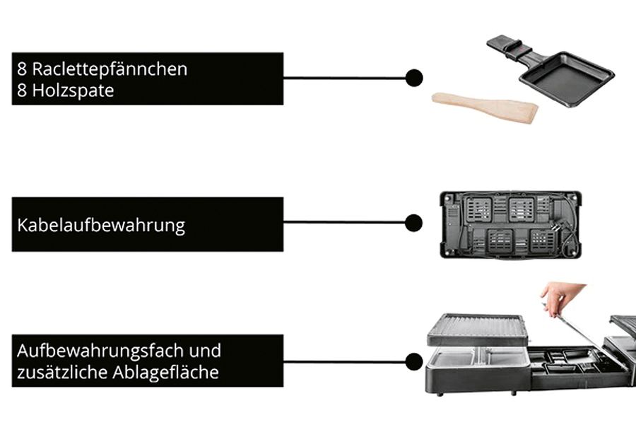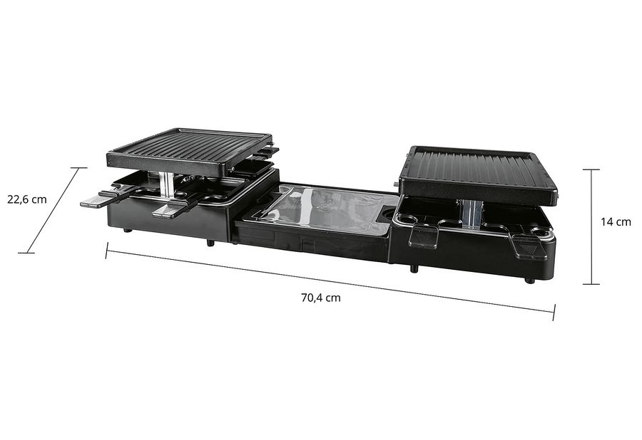 Das UNOLD Raclette Extendable ist ein ausziehbares Raclette-Gerät und somit die perfekte Wahl für gesellige Mahlzeiten, egal ob in kleiner oder großer Runde mit bis zu 8 Personen. Durch die Auszieh-Funktion lässt es sich mühelos an kleinere und größere Tische anpassen, was es besonders flexibel macht. Trotz seines kompakten Designs bietet es zudem ein praktisches Fach zur Aufbewahrung der Raclette-Pfännchen.