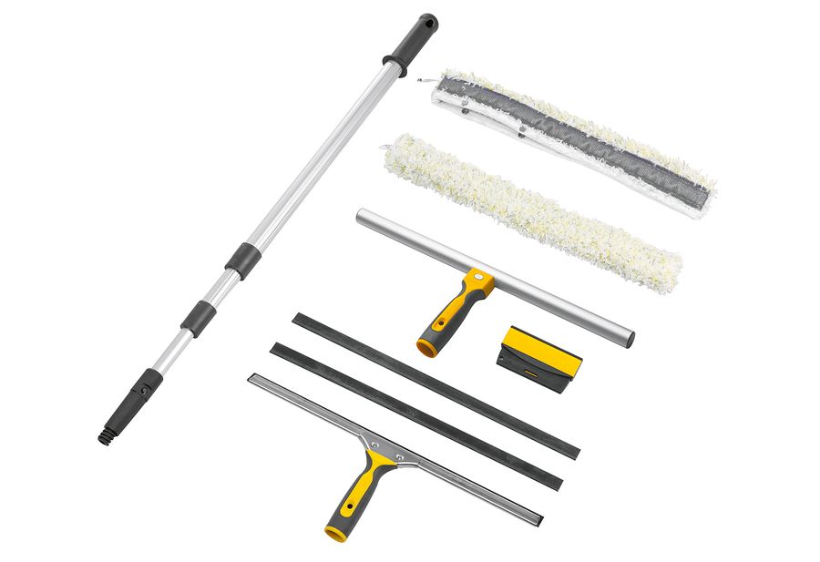 Kunststoff / Polyester / Aluminium / Gummi, für Trocken- und Nassreinigung von Fenstern, Glasscheiben sowie glatten Oberflächen, professionelle Reinigung ohne Schlieren oder Rückstände, mit der Teleskopstange ist es möglich zügig und damit ermüdungsfrei zu arbeiten, inklusive Sicherheitsschaber, um Aufkleber oder Farbreste entfernen zu können·anthrazit / gelb