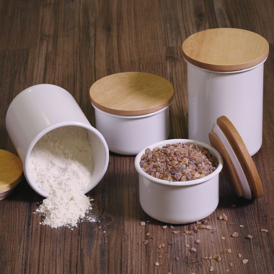 Stilvoller Vorratsbehälter aus Emaille mit hochwertigen Holzdeckel, Größe M, mit 800ml Fassungsvermögen