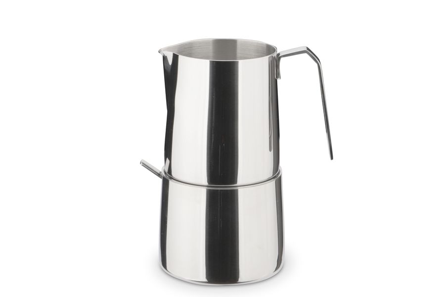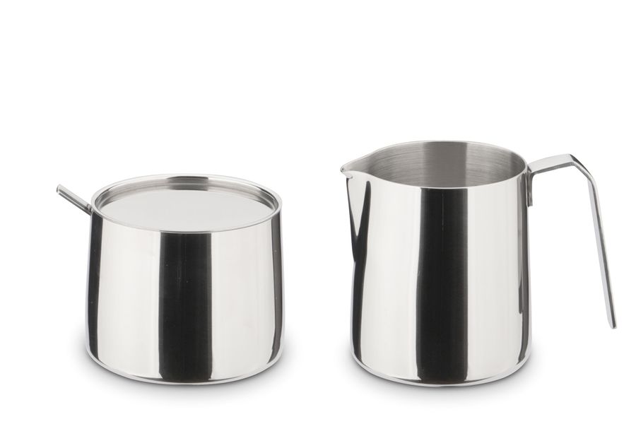Edelstahl, aufeinander stapelbar, Inhalt: 1 Milchkännchen mit tropffreiem Ausguss, 1 Zuckerdose inkl. Deckel, 1 Löffel, spülmaschinenfest, Zuckerdose fasst ca. 200 g, Milchkännchen ca. 350 ml Ø 7,3 cm, H 8 cm