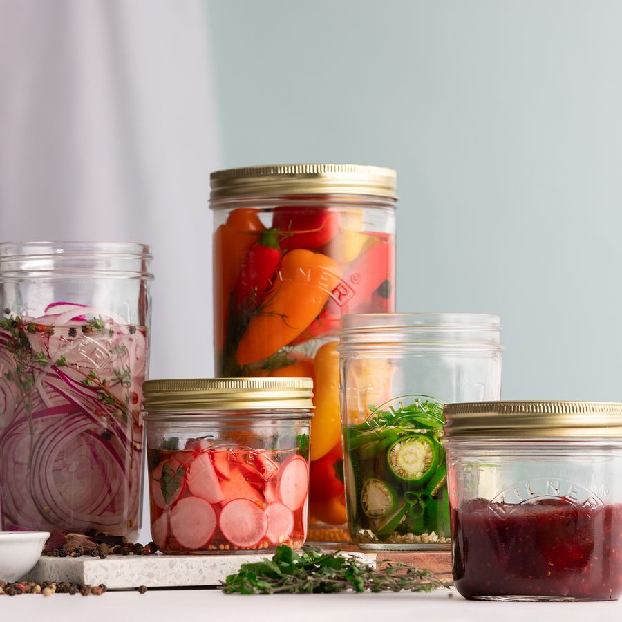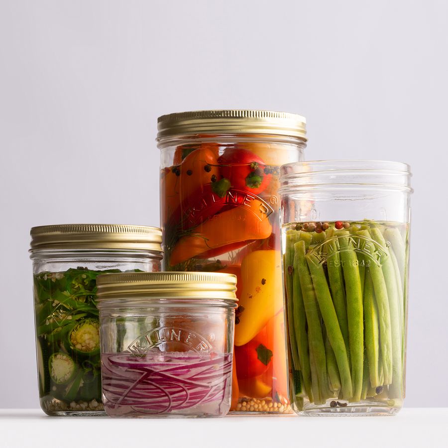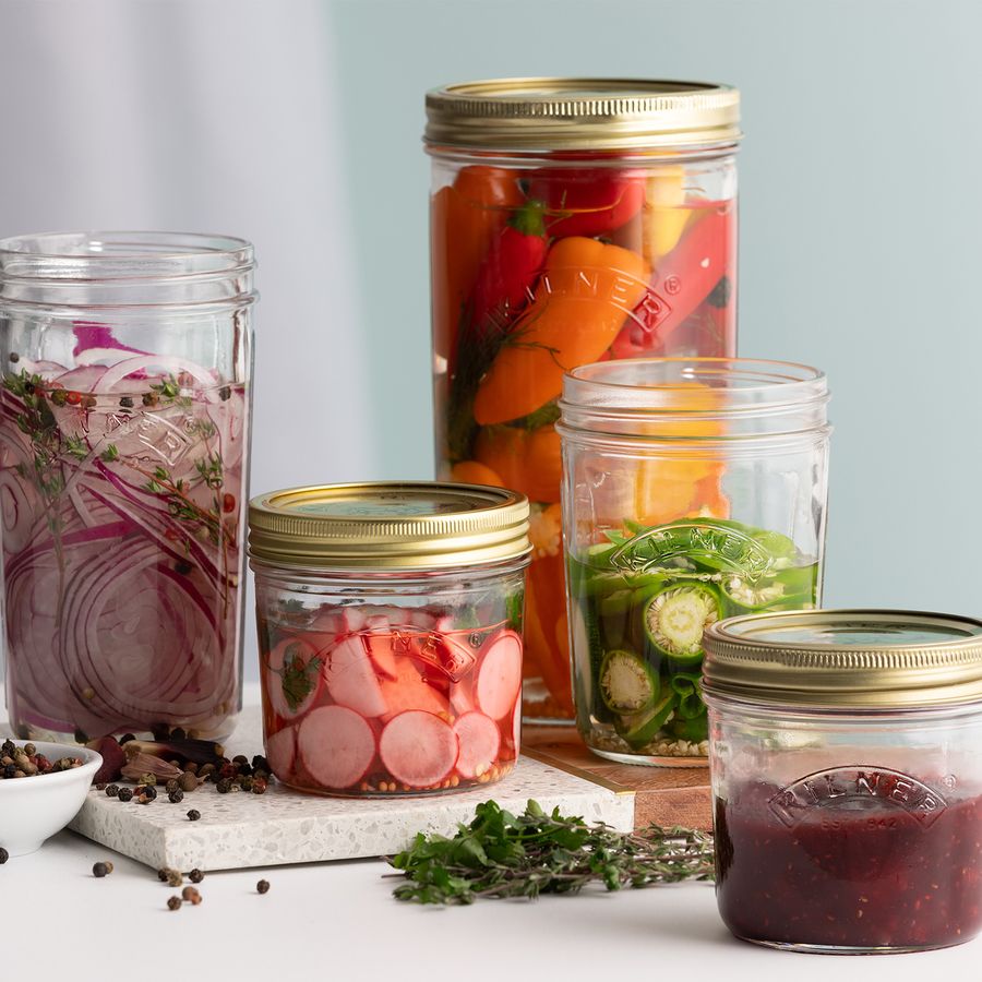 Die Kilner® Gläser mit weiter Öffnung sind ideal für die Konservierung von Obst und Gemüse als Ganzes. Die große Öffnung macht einfaches Befüllen auch von großen Lebensmitteln möglich. Das Glas enthält einen einfach zu bedienenden Metall-Schraubverschluss, welcher aus einem 2-teiligen Metallschraubdeckel und einer austauschbaren Vakuumdichtung besteht. Dieses Einmachglas ist mit 350 und 500 ml Fassungsvermögen erhältlich.