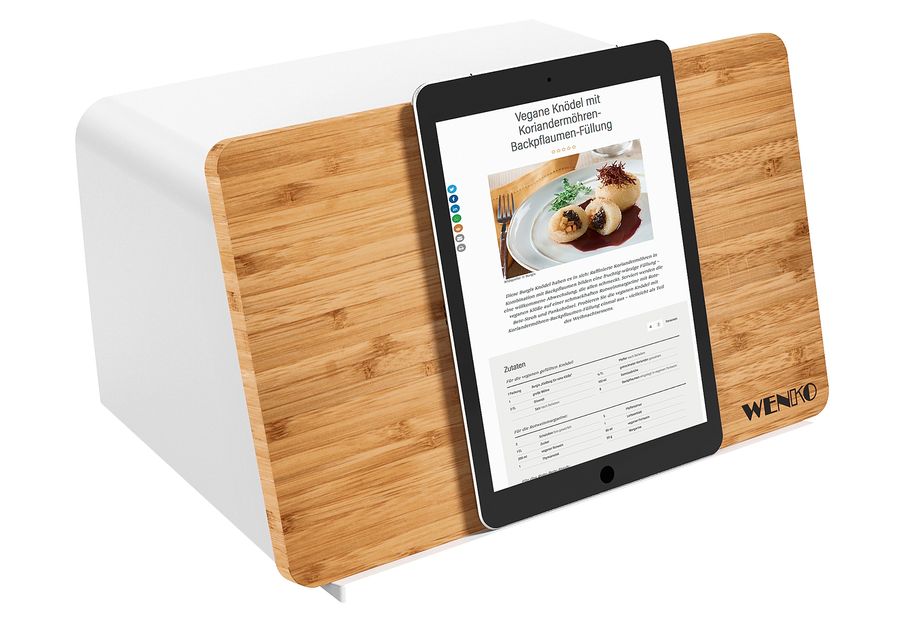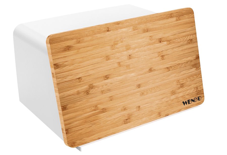 Kunststoff (PVC/PU), mit Bambusbrett als Deckel, gewährleistet eine dunkle Lagerung ist auch als Schneidebrett zu nutzen, vor dem Schneidebrett lässt sich optimal ein Tablet oder ein Smartphone anlehnen um z.B. Kochrezepte im Blick zu haben, der Kasten hat zwei Ebenen im Inneren, Belüftungslöcher auf der Rückseite sorgen für eine optimale Luftzirkulation·weiß (LxBxH): 37x27x23 cm