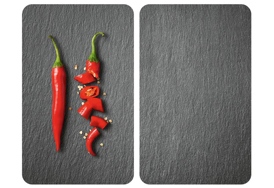 Schieferoptik, Inhalt: 1 x uni, 1 x mit Motiv "Chilis", kratzfeste, porenfreie hygienische Oberfläche, robust und schlagfest, geruchsneutral, hitzebeständig bis 200 °C, 8 rutschfeste Füße in unterschiedlichen Höhen für verschiedene Herdarten, für Glaskeramik-, Elektro- und Gasherde geeignet···· (LxBxH): je 30x1,8-5,5x52 cm
