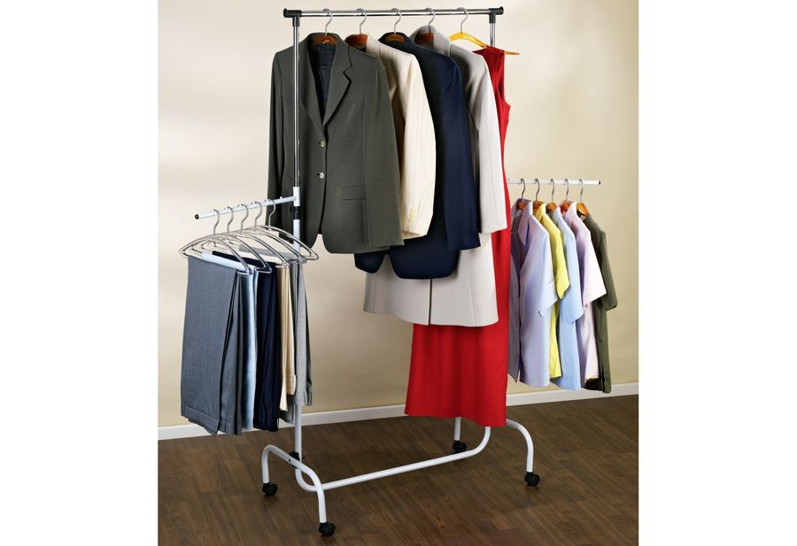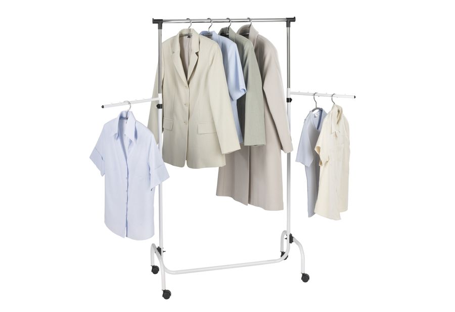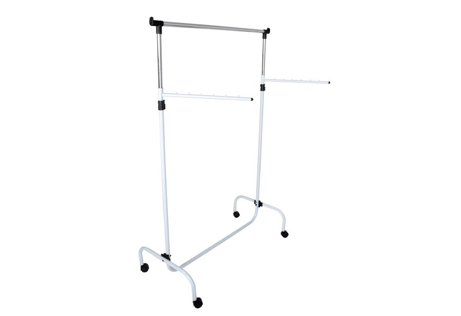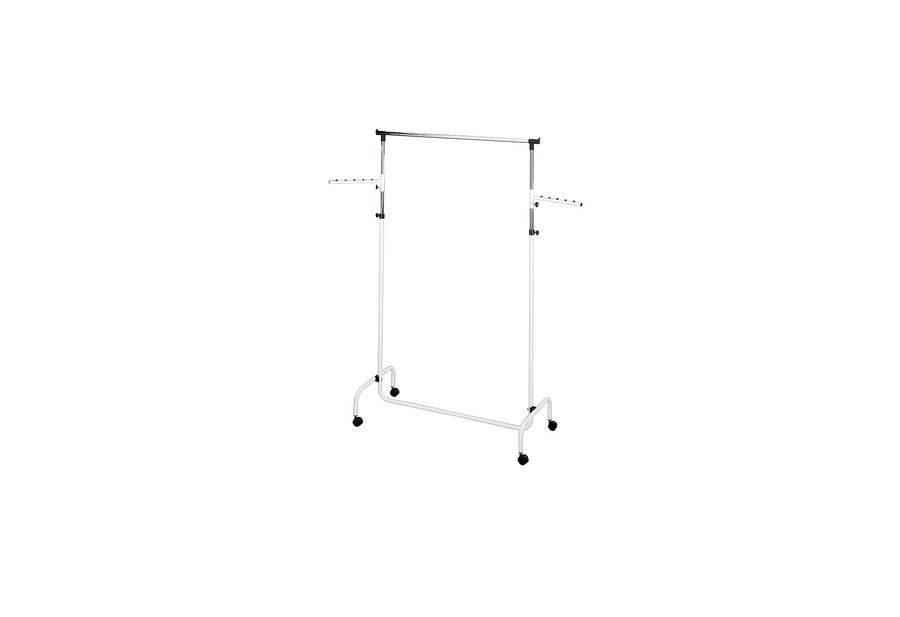 lackiert, höhenverstellbar von 118 cm bis 190 cm, mit 4 stabilen Lenkrollen, verchromte Kleiderstange 100 cm lang, mit 2 Seitenhaken, Tragkraft bis 20 kg· (HxT): 160x45 cm