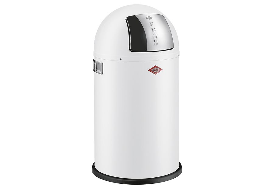 Stahlblech, pulverbeschichtet / Kunststoff, mit Edelstahlklappe, Einsatz aus Metall, ein Kunststoffrand am Korpus schont den Fußboden, der Leitring im Innern verhindert, dass Müll zwischen Korpus und Einsatz rutscht··weiß matt 22 l, (BxH): 35x63 cm
