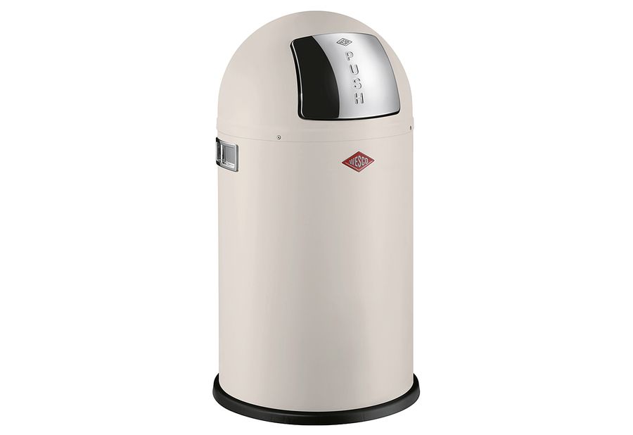 Stahlblech, pulverbeschichtet / Kunststoff, mit Edelstahlklappe, Einsatz aus Metall, ein Kunststoffrand am Korpus schont den Fußboden, der Leitring im Innern verhindert, dass Müll zwischen Korpus und Einsatz rutscht··sand matt 22 l, (BxH): 35x63 cm