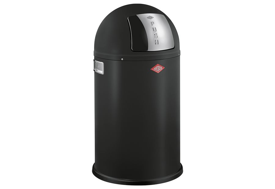 Stahlblech, pulverbeschichtet / Kunststoff, mit Edelstahlklappe, Einsatz aus Metall, ein Kunststoffrand am Korpus schont den Fußboden, der Leitring im Innern verhindert, dass Müll zwischen Korpus und Einsatz rutscht··schwarz matt 22 l, (BxH): 35x63 cm