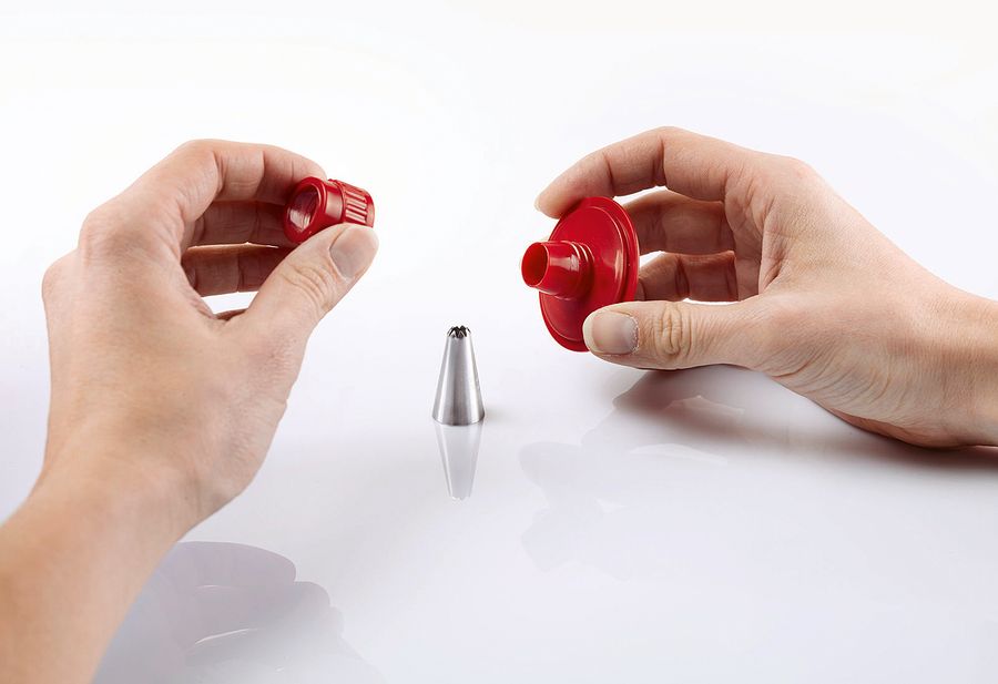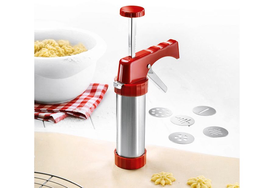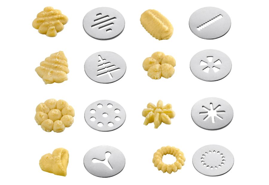 Edelstahl / Kunststoff, Inhalt: 1 x Presse, 8 x Formscheiben, 8 x verschiedene Tüllen, komfortabler Druckmechanismus, mit Rezepten