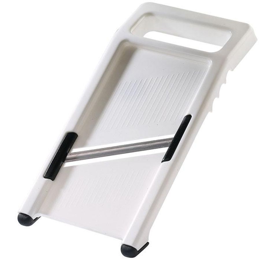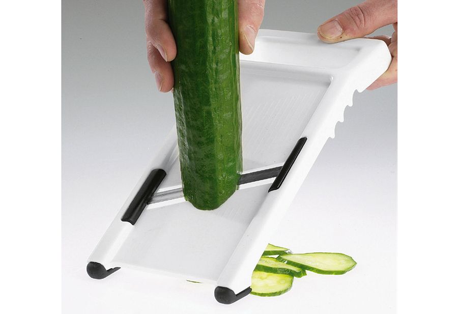 ABS / Klinge Edelstahl rostfrei, breite Auflagefläche für viele Frucht- und Gemüsesorten, rutschfeste Gummifüße, Auflagerasten für sicheren Halt auf Schüsseln und Töpfen, beidseitig schneidende Klinge·weiß (LxBxH): 26,7x12x3,8 cm