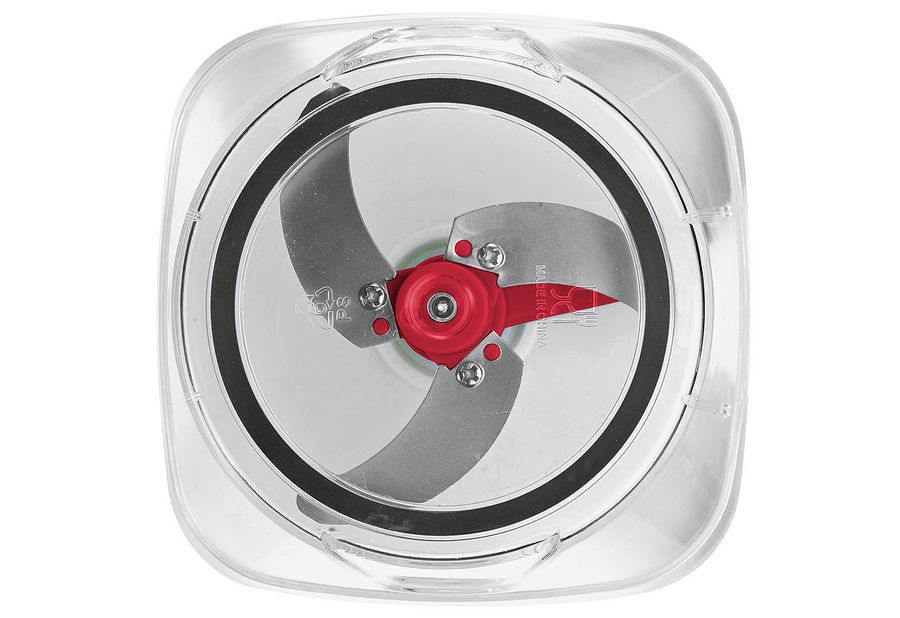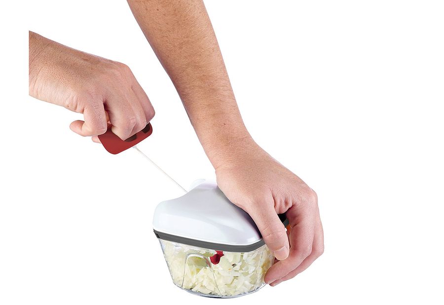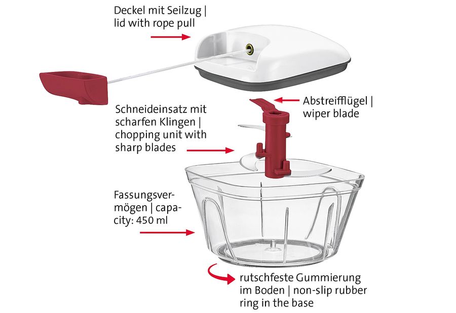 Edelstahl, PP, ABS, POM, PS, TPE, einfaches und schnelles Zerkleinern von Obst, Gemüse, Kräutern und Nüssen, sehr scharfe Klingen, rutschfester Boden, leicht zu bedienender Seilzug, nicht spülmaschinengeeignet·weiß-rot 450 ml, (LxBxH): 11,7x11,7x10 cm
