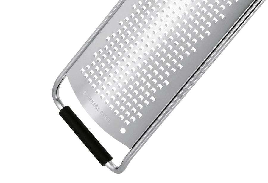 hochwertiger Edelstahl, fein, professionelle Ätztechnik, außergewöhnlich scharfe und langlebige Klinge, rutschfestes Gummi, Klingenschutz, Reibe fein u. a. für: Orangen, Zitronen, Zimt, Chili, Knoblauch, Ingwer, Muskatnüsse, Reibe grob u. a. für: Käse, Kartoffeln.· (LxBxH): 32,5x6,5x2,8 cm