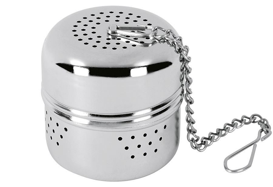 Rostfreier Edelstahl, Zylinderform, auseinanderschraubbare Siebhälften, feinporiges Sieb, Kette mit Haken erleichtert die Befestigung, spülmaschinengeeignet Ø 4 cm, H 4 cm