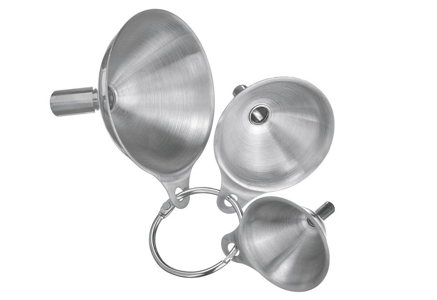 Edelstahl, zum präzisen Abfüllen kleiner Flüssigkeitsmengen in Behältnisse wie Kosmetik-Fläschchen und Gläser mit sehr schlanker Einfüllmündung, Abmessungen: Ø 45, 55, 75 mm, spülmaschinengeeignet