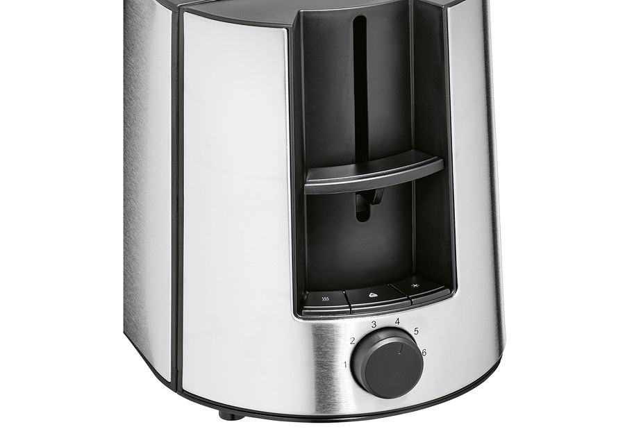 Gehäuse aus hochwertigem Cromargan® matt, 6 variabel einstellbare Bräunungsstufen, beleuchtete Funktionstasten (Stopp-, Aufwärm-/ Nachtoast- und Auftau-Funktion), integrierter Brötchenaufsatz, integrierte Brotzentrierung für gleichmäßige Bräunung, herausnehmbare Krümelschublade, Leistung: 730-870 Watt, Schukostecker CEE 7/7