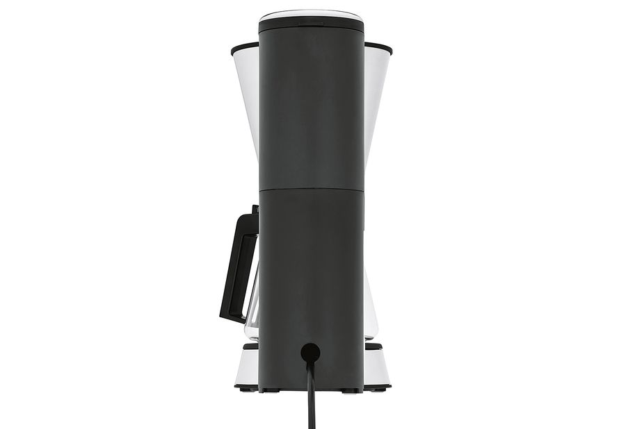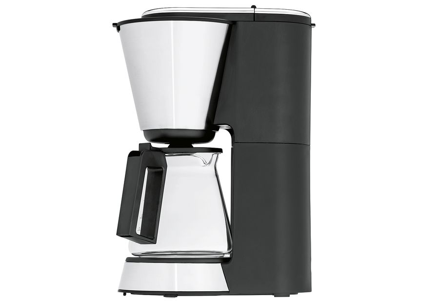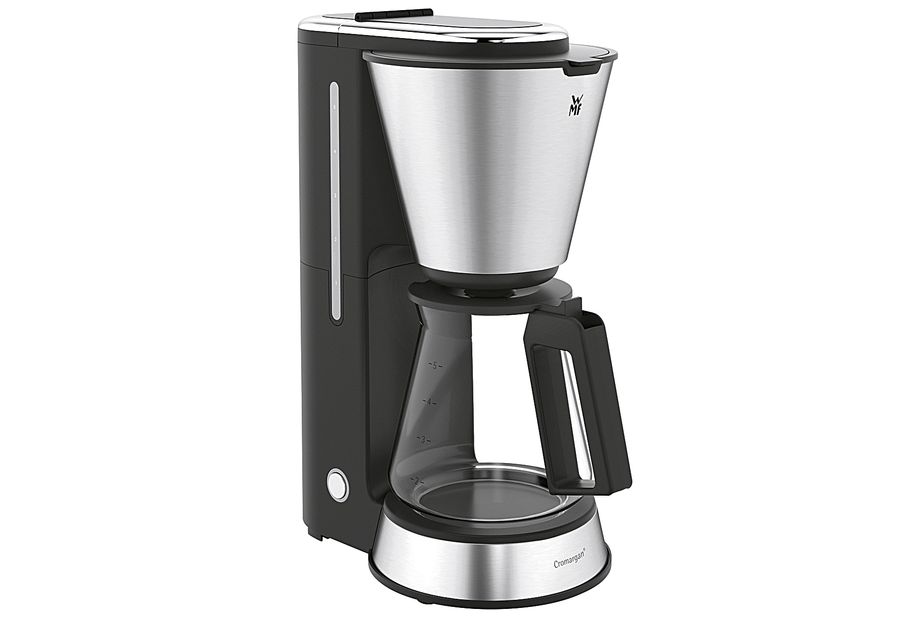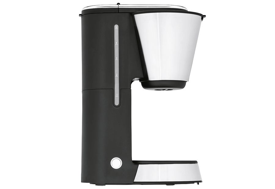 Gehäuse aus hochwertigem Cromargan® matt, Kaffeemaschine mit Aromaglaskanne für fünf Tassen à 125 ml, platzsparendes Design, WMF Heißbrüh-Technologie für aromatischen Kaffee ab der ersten Tasse, herausnehmbarer Filtereinsatz (Größe 2) mit Tropfstopp, außenliegende Wasserstandsanzeige, Warmhalteplatte mit Abschaltautomatik, einfache Wassertankbefüllung, beleuchtete Starttaste, Leistung: 760 Watt, Schukostecker CEE 7/7·schwarz/edelstahl