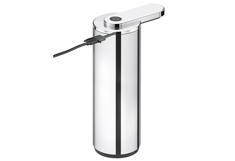 Edelstahl 18/10 hochglanz poliert / Innenbehälter (PETG) zum Einschrauben, standfest, kontaktfreier Infrarot Sensor, eignet sich für Flüssigseife, Lotionen und Desinfektionsgel, die Abnahmemenge ist in 2 Stufen wählbar, kein Nachtropfen, mit aufladbarem Akku (2W DC 5.0V/ 0,8A), 1800mAh Li-Ion), USB-Kabel liegt bei, lange Akkulaufzeit Ø 6,3 cm, H 18,8 cm