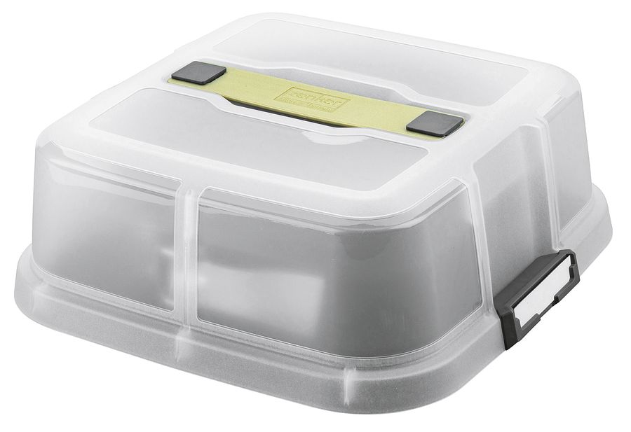 Stahlblech / PP, extra hoher Rand (8 cm), hitzebeständig bis +230°C, nur Handreinigung, Teflon Classic Antihaft-Beschichtung für einfaches herauslösen des Kuchens, transparente Haube zum Transportieren, zwei beschriftbare Magnetschilder·schwarz / transparent Springform Ø 24 cm, Boden (LxB): 30x30 cm