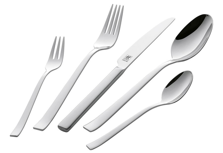 Edelstahl 18/10 matt, für 12 Personen, enthält 12 Menümesser, 12 Menügabeln, 12 Menülöffel, 12 Kaffeelöffel, 12 Kuchengabeln, 1 Suppenlöffel, 2 Fleischgabeln, 2 Servierlöffel, 1 Saucenlöffel, 1 Tortenheber, 1 Zuckerlöffel, spülmaschinengeeignet