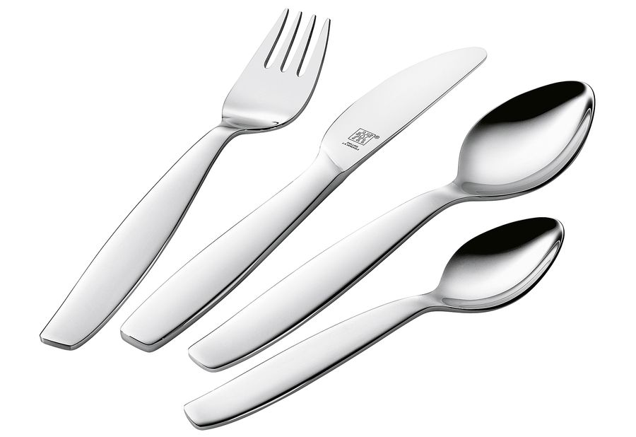 Edelstahl 18/10, Inhalt: je 1 x Messer, Gabel, Esslöffel und Teelöffel, speziell für kleine Hände entwickelt, mit abgestumpftem Messer, abgerundeten Gabelspitzen, eignet sich für Kinder ab 3 Jahren, spülmaschinengeeignet
